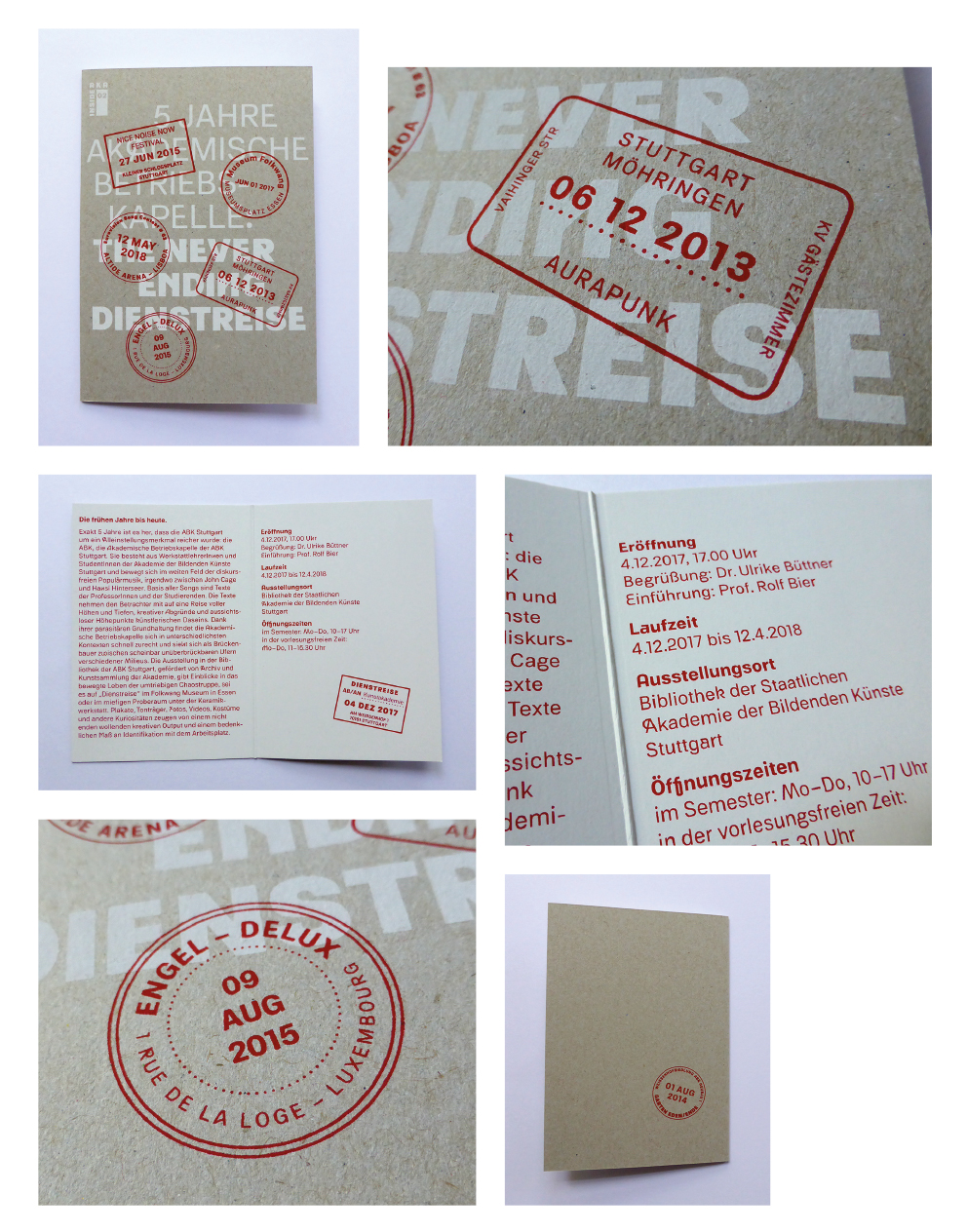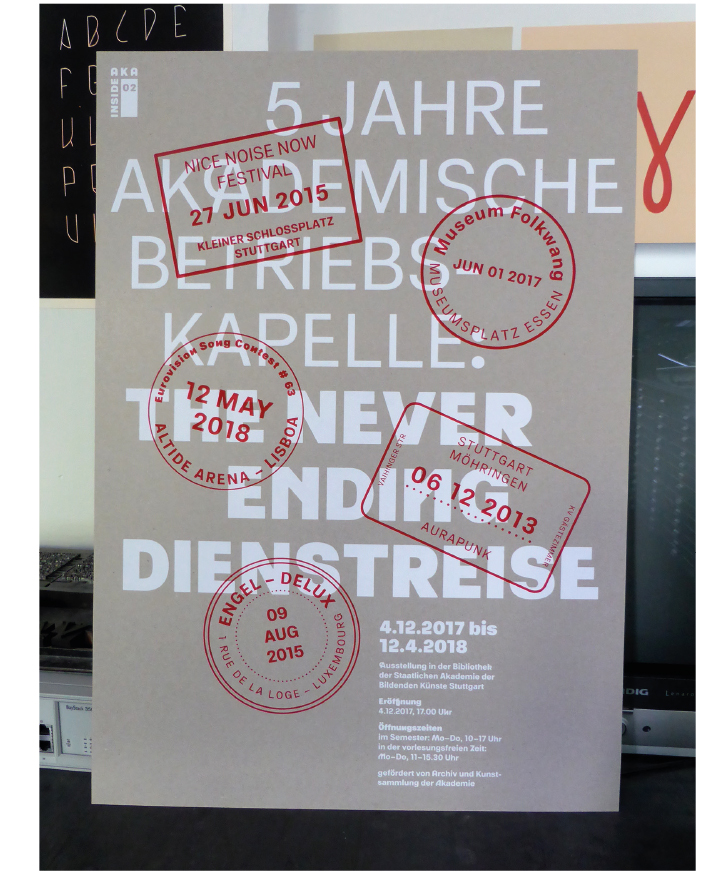 Poster and invitation card for the exhibition "5 Jahre Akademische Betriebskapelle: The never ending Dienstreise" (2017) typeface: beta version of "ABK Stuttgart" by Stefanie Schwarz and Dirk Wachowiak