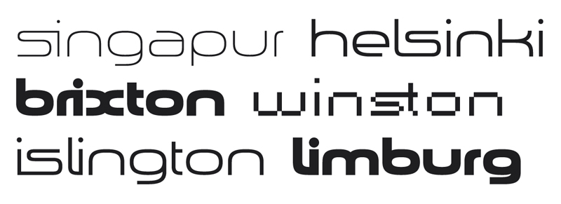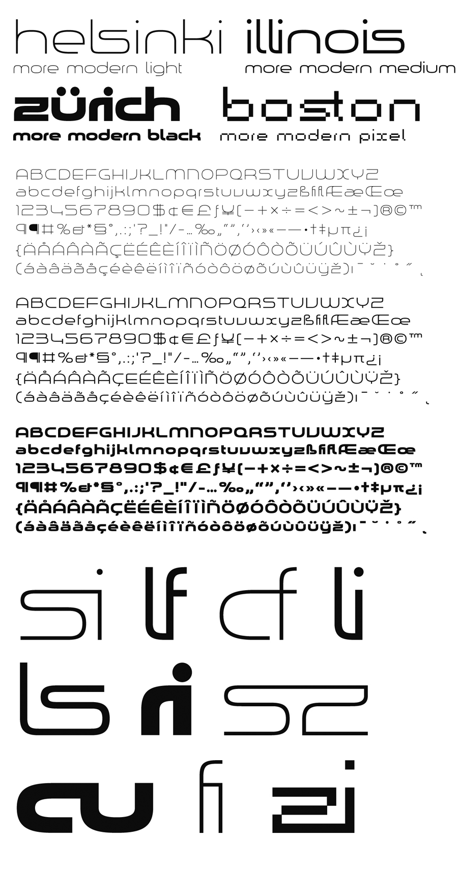 The typeface "More Modern" has three weights: light, medium and black, plus a pixel font. Each font includes a set of about 80 ligatures. (2004/05) In December 2005 "More Modern" was released by the digital type foundry T26 in Chicago, IL, USA.
