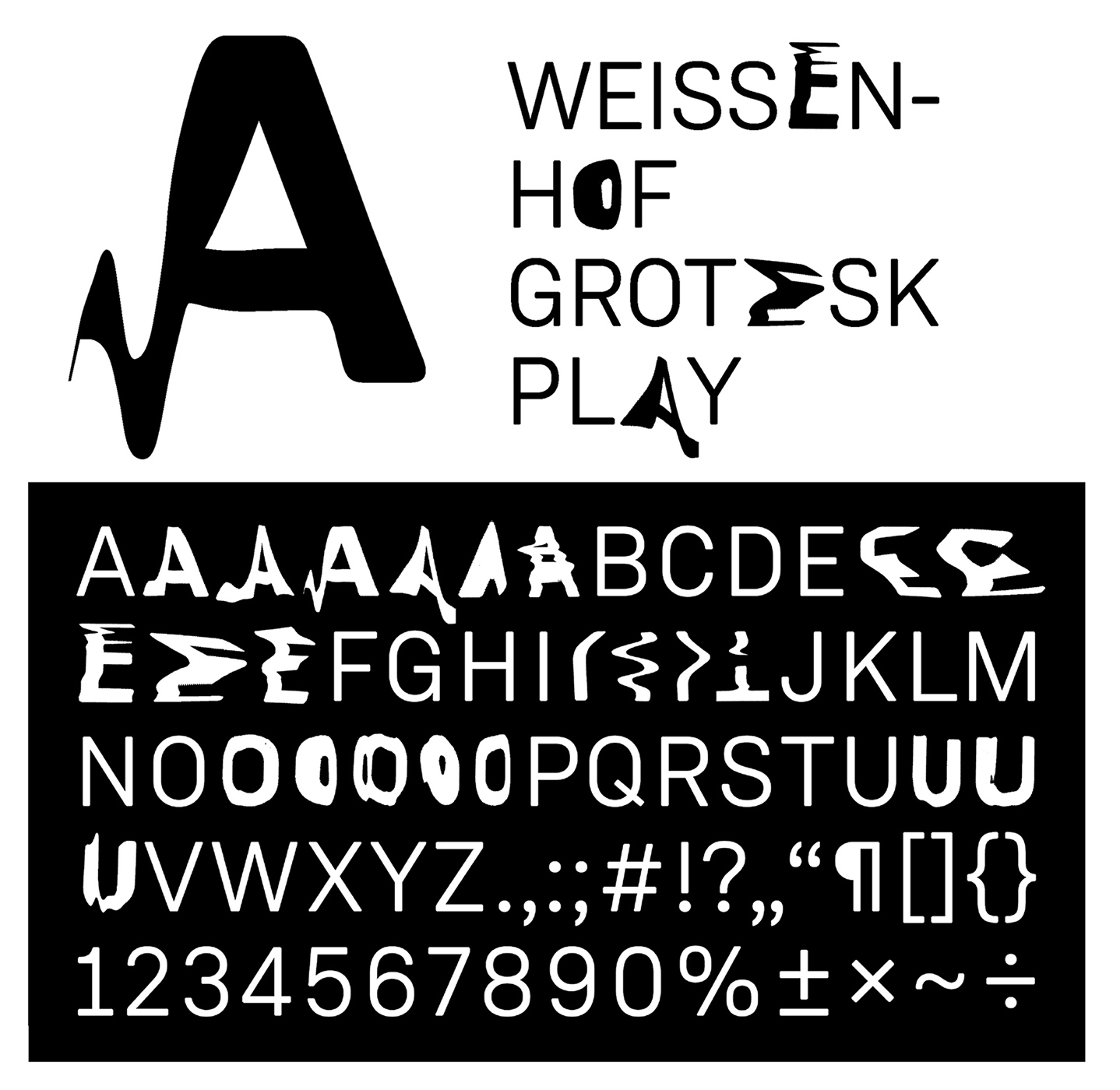 Weissenhof Grotesk Play is an additional font style of the type family Weissenhof Grotesk that includes an extended collection of vowels, initially inspired by events and actions around the temporary art space Satellit Stuttgart (2021)